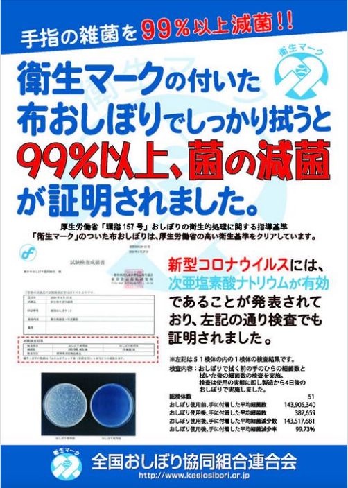 (※衛生マークのおしぼりで手を拭うと、手洗いと同等の効果があると公表されています)