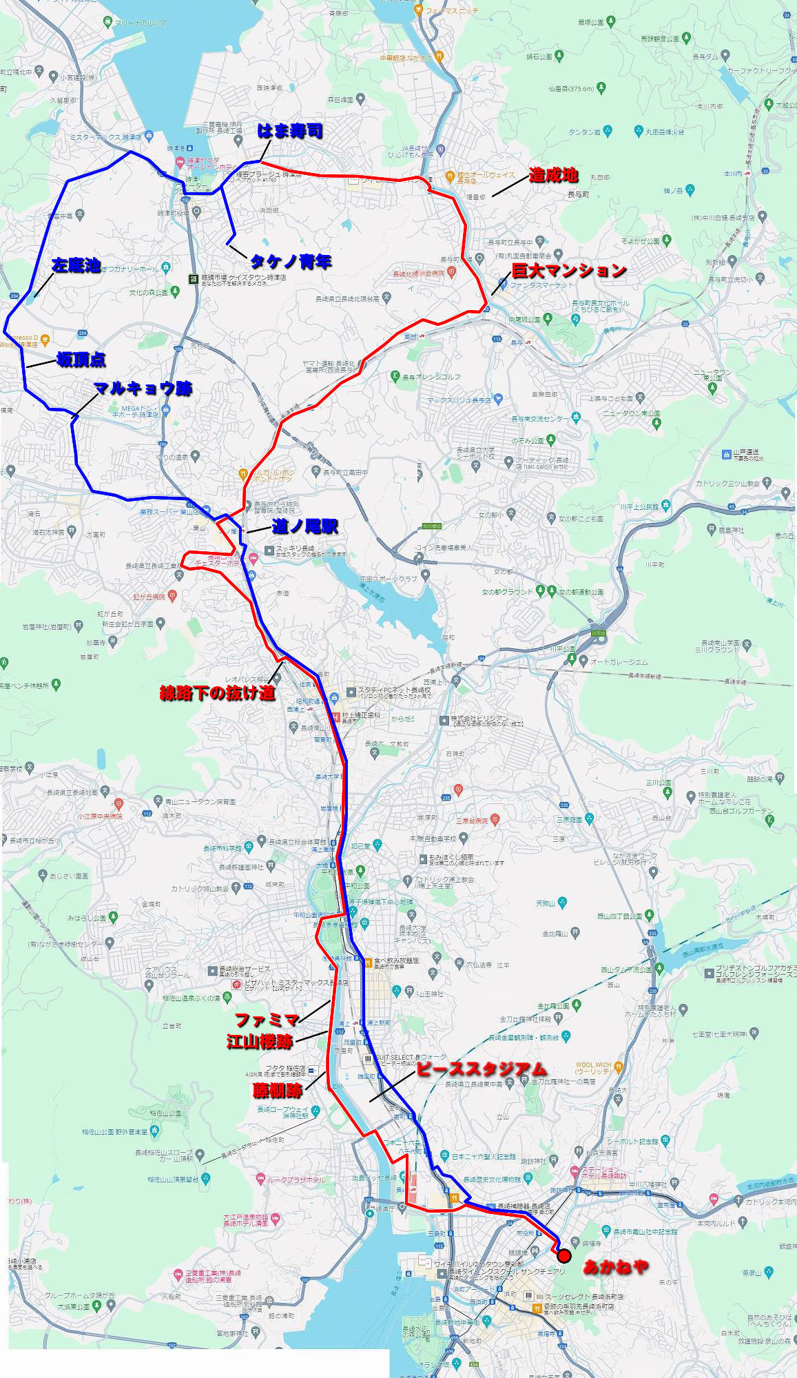 今回の経路 ↓(赤=往路、青=復路)