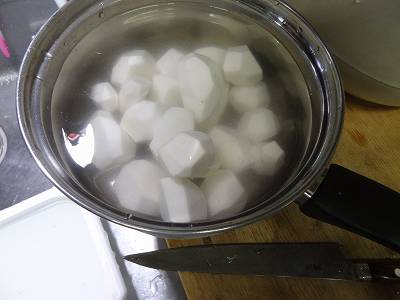 大きいのは皮を剥いて鍋で水からひと煮立ち。