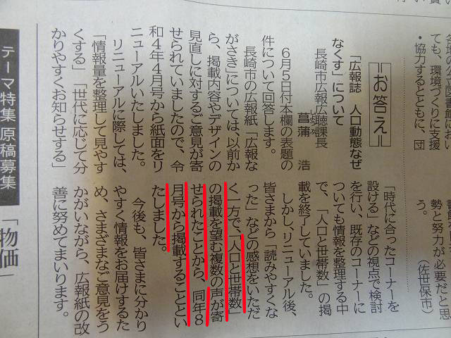 長崎市の人口を載せてほしいとの要望を投書されてる方がいた。