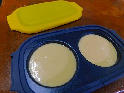 作った生地を丸型パンに流し込んで・・