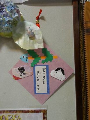 例によって近所の保育所の子供たちが作ったかわいい飾りをいただいた。