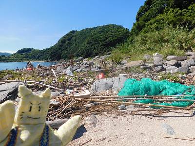 この海岸漂着物だらけですんごっく歩きづらいでやんすね。」